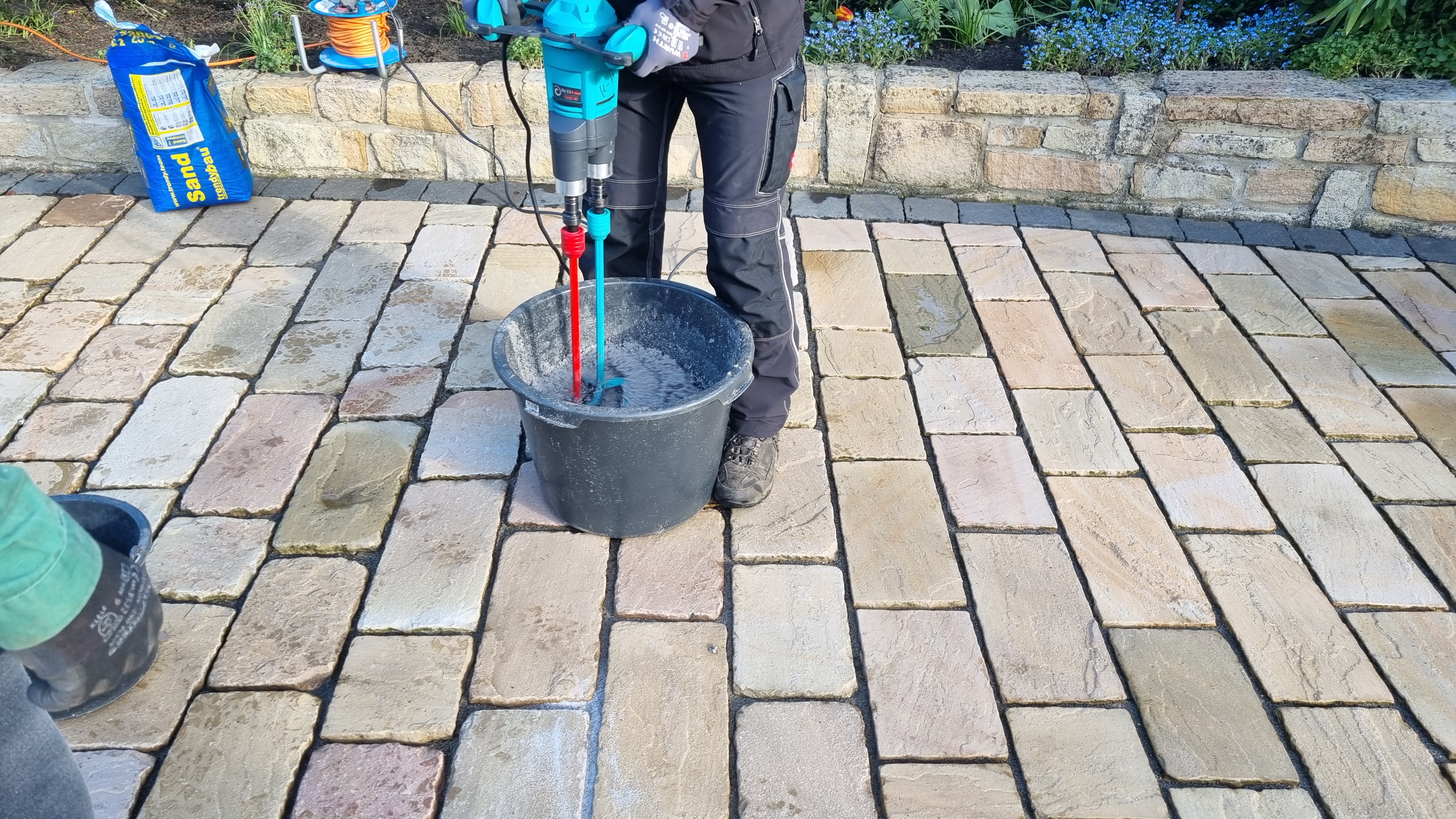 1. Reinigung und Vorbereitung der Fläche: Zunächst werden die Stein- und Pflasterflächen gründlich gereinigt, um Schmutz, Unkraut und alte Fugenreste vollständig zu entfernen. Dies schafft die optimale Basis für eine langlebige und stabile Verfugung.